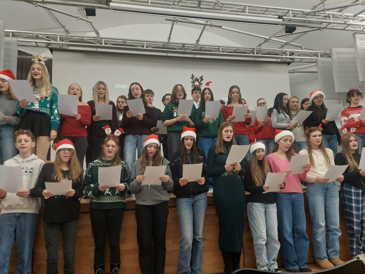 Am Dienstag trafen wir uns alle im Saal, um uns gemeinsam auf das Weihnachtsfest einzustimmen. Eröffnet wurde das Fest mit einer weihnachtlichen Geschichte, vorgetragen von Frau Professor Kasper. Weiters wurde das Fest mit lustigen Spielen gestaltet, in denen sich Schüler:innen sowie Professor:innen duellieren und ihr weihnachtliches Wissen auf die Probe stellen konnten. Unter anderem mussten sowohl Lehrkräfte als auch Schüler:innen unförmige Geschenke verpacken, umso zu beweisen, wer sich am besten als Weihnachtselfe eignet. Für den Sieger gab es anschließend etwas Süßes als kleine Belohnung.