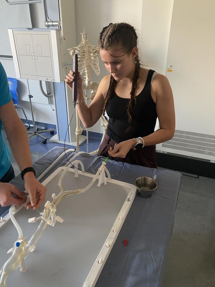 Beim ersten Besuch stand die Radiologietechnik im Mittelpunkt. Nach einem spannenden Vortrag folgte gleich eine Führung mit beeindruckenden Einblicken hinter die Kulissen. Die Schüler:innen konnten hautnah das Magnetfeld des MRTs erleben, Unterschiede und Gemeinsamkeiten zwischen Röntgen, Ultraschall und CT erfahren sowie den Schockraum sehen. Im Anschluss durften sie in Kleingruppen einerseits selbst einen Stent an einer Übungsaorta setzen sowie in die Zukunft der bildgebenden Verfahren eintauchen.