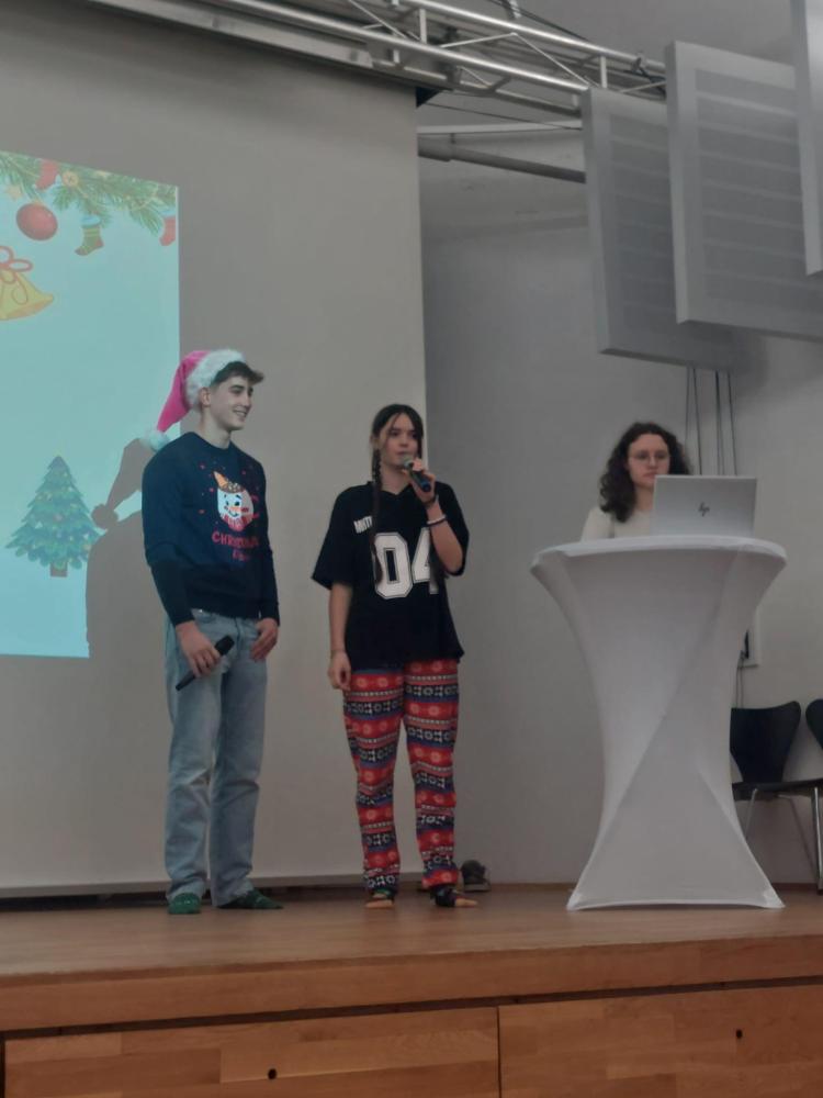 Am Dienstag trafen wir uns alle im Saal, um uns gemeinsam auf das Weihnachtsfest einzustimmen. Eröffnet wurde das Fest mit einer weihnachtlichen Geschichte, vorgetragen von Frau Professor Kasper. Weiters wurde das Fest mit lustigen Spielen gestaltet, in denen sich Schüler:innen sowie Professor:innen duellieren und ihr weihnachtliches Wissen auf die Probe stellen konnten. Unter anderem mussten sowohl Lehrkräfte als auch Schüler:innen unförmige Geschenke verpacken, umso zu beweisen, wer sich am besten als Weihnachtselfe eignet. Für den Sieger gab es anschließend etwas Süßes als kleine Belohnung.