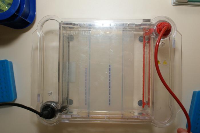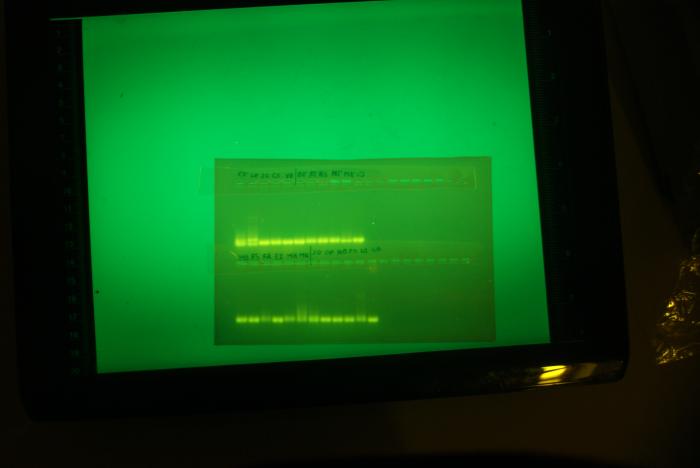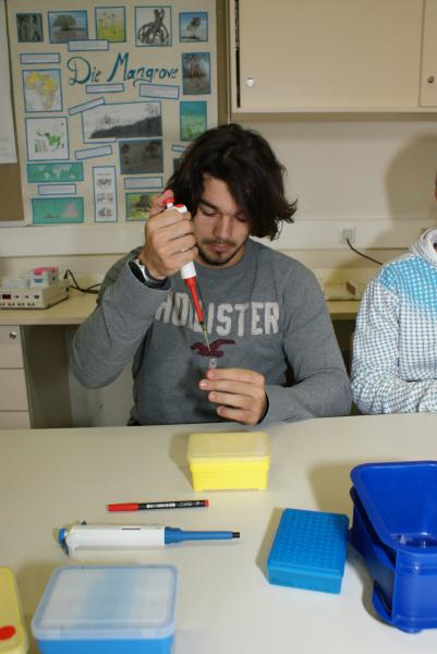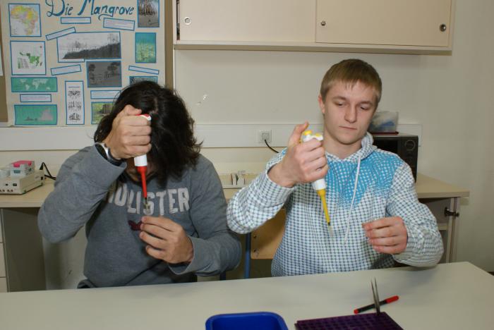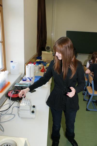 Diese 24 Leute von den Klassen 8k, 8l, und 8n hatten nämlich beschlossen, sich im Rahmen des DNA-Analytikkurses auf dem Gebiet der Genanalyse (weiter)zubilden. Unsere anfängliche leichte Skepsis und Nervosität wurde schnell von dem sympathischen und humorvollen Kursleiter zerstreut. Unser "Master", Mag. Reinhard Nestelbacher, schaffte es auf wundersame Weise, uns die komplizierten Vorgänge von der DNA-Isolation bis hin zur PCR (Polymerase-Chain-Reaction) und dem Sichtbarmachen der DNA näher zu bringen. Aber auch die Zusammenarbeit über Klassengrenzen hinaus erleichterte es, so manche schwierige Aufgabe leichter zu bewältigen. Am Ende des Tages waren wir wahre Spezialisten im exakten Pipettieren und hatten auch ein ansehnliches Wissen über die Welt der Gene und deren Analyse angesammelt. Mit einem genauen Protokoll und unter der mehr oder weniger strengen Anleitung vom "Master" kamen wir Schritt für Schritt unserer vollkommen isolierten DNA, die anfangs noch an einem Wattestäbchen klebte, immer näher. Einige scheinbar besonders gewissenhafte SchülerInnen hatten sogar das Glück, ihre DNA nicht im Waschbecken oder anderswo im Klassenzimmer verloren zu haben, sondern sie mit Spezialbrillen auf dem Elektrophorese-Gel bestaunen zu können.