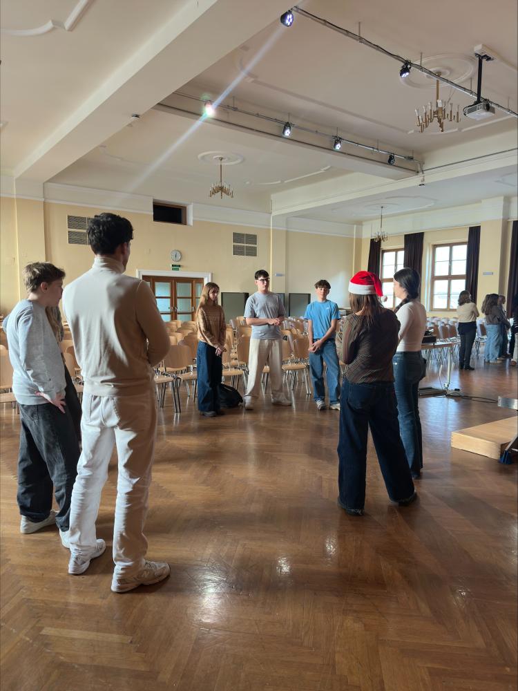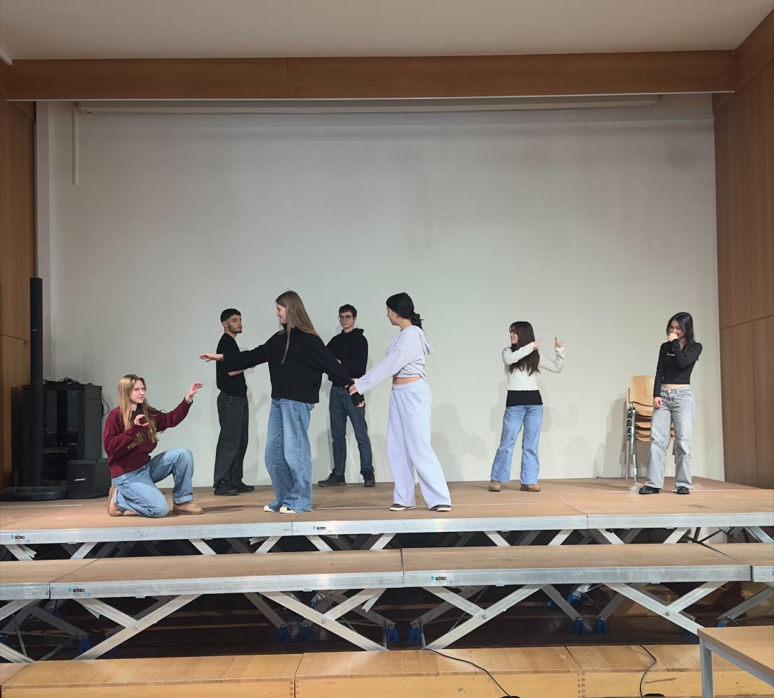Unter der Leitung von Frau Professorin Bauer und mithilfe der Kommunikations-Schülerinnen, wurden mehrere Formen des Impro-Theaters vorgestellt und gemeinsam ausprobiert. Die 5. und 6. Klassen waren dabei nicht nur Zuschauer, sondern wurden aktiv zu Schauspielerinnen und Schauspielern und sammelten somit erste Bühnenerfahrung. Ein weiterer Programmpunkt war der Podcast-Workshop der K-Klasse. Mit Unterstützung von Professorin Gratzl und Professor Kaufmann entstanden weihnachtliche One-Take-Podcasts, von denen die besten demnächst auf unserem Schul-Spotify veröffentlicht werden.